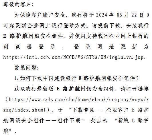 关于更新中国建设银行胡志明市分行 企业网上银行登录方式的通知